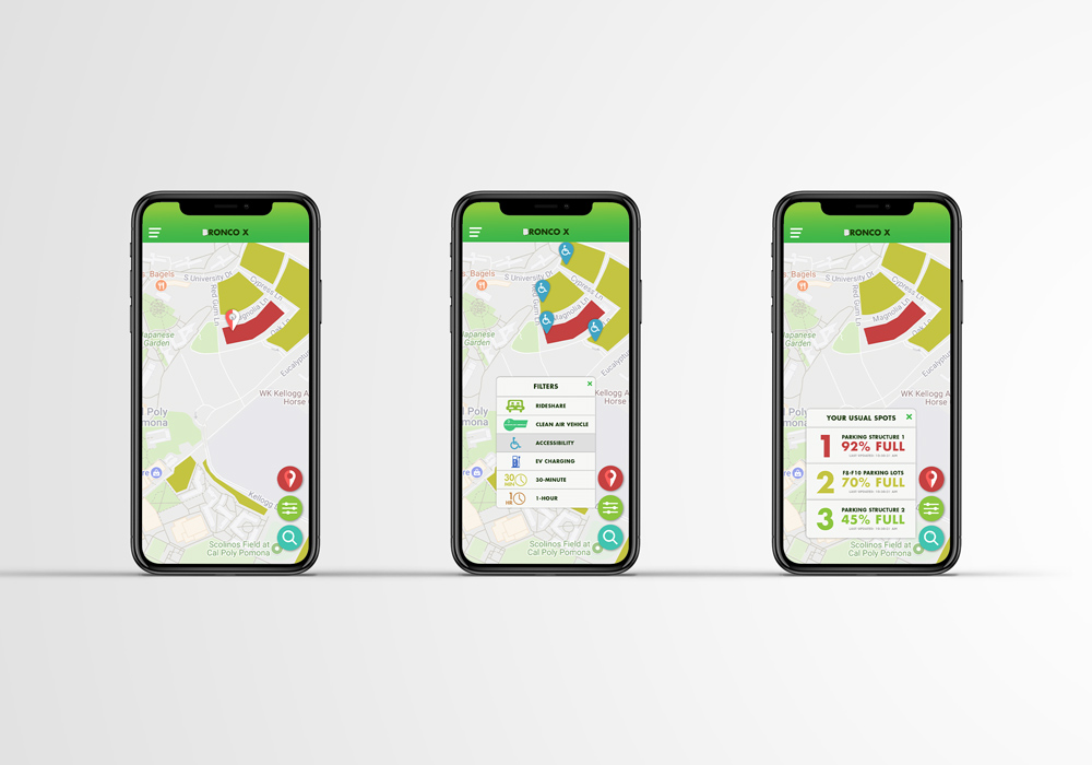 BroncoX is a parking utility app designed with the students, staff, and visitors of Cal Poly Pomona in mind. Integrated with the current parking system of the campus, BroncoX creates a seamless experience for drivers to park. The app features real-time updates on all parking lots and filters to personalize any of the user’s needs. Click here to play around with its live prototype.