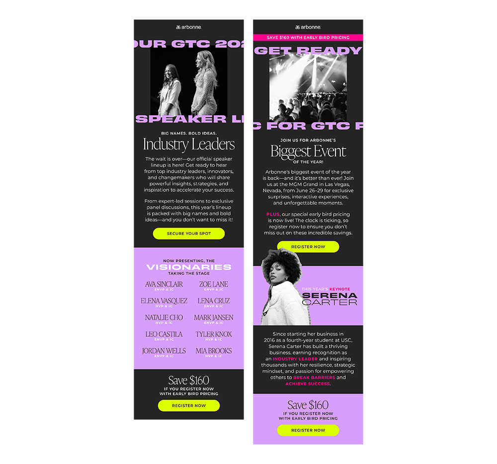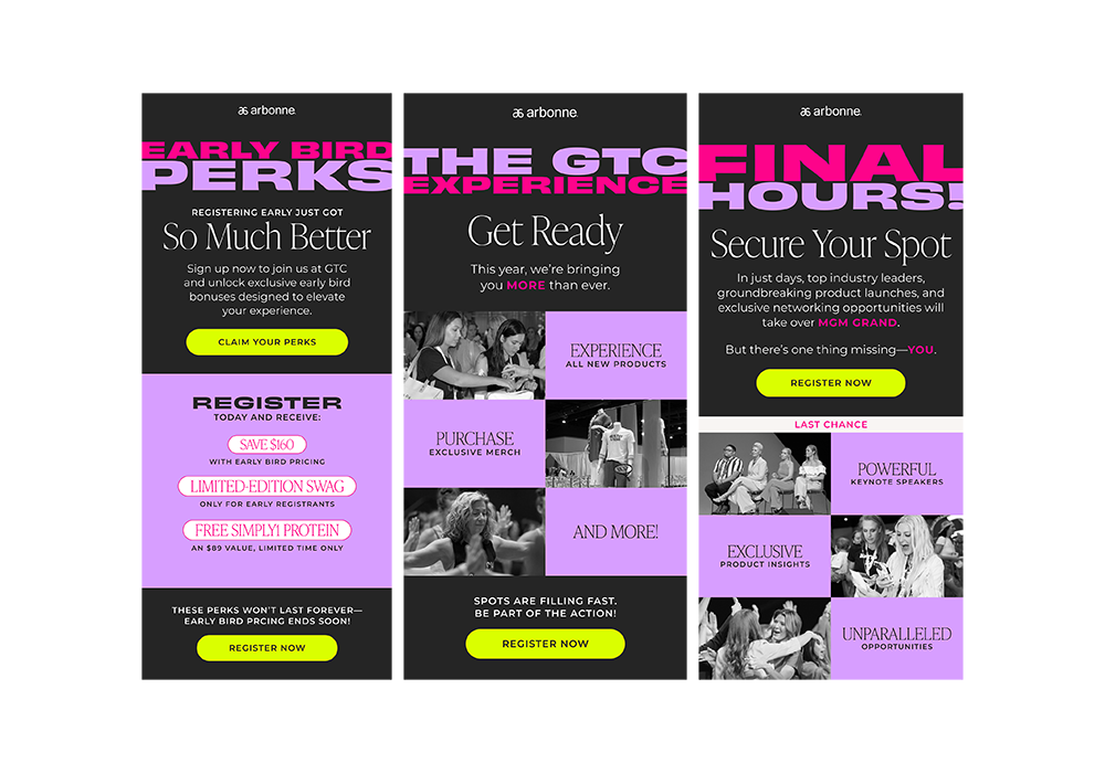 GTC 2024: Accelerate is Arbonne's flagship annual conference, uniting the international Arbonne community for a four-day experience filled with networking, learning, and fun. The digital marketing experience ensured full engagement of attendees through dynamic content across all digital touchpoints, boosting brand visibility and generating excitement for the brand's biggest event of the year. As a result, the event welcomed over 8,800 paid attendees.